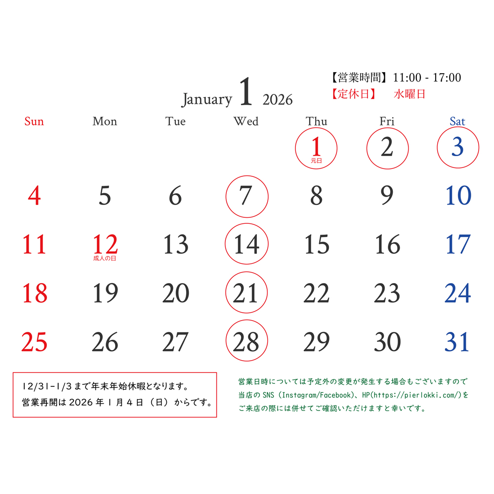 当店へのお出かけ前には、お手数お掛け致しますが、PiroleikkiのSNS(Instagram・Facebook)や、ホームページをご確認下さいませ。
