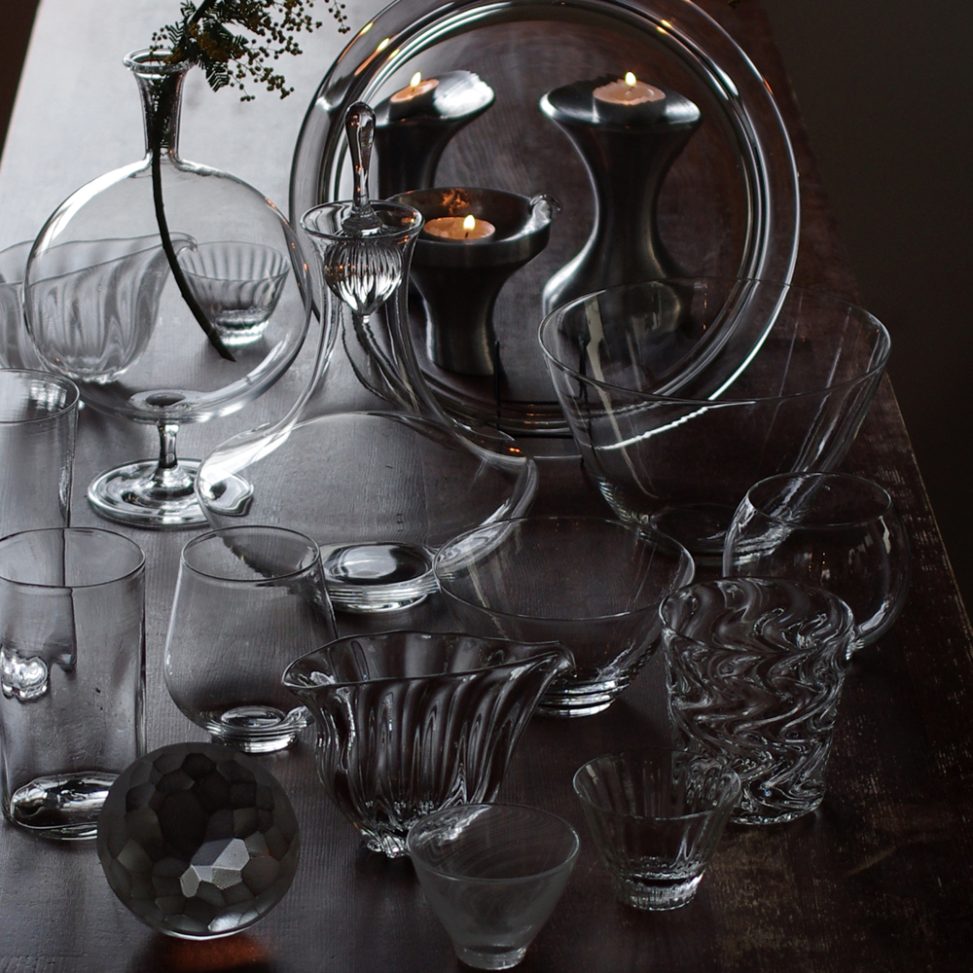 秋田、新島(東京)、富山など、各所で修練した技巧で制作する、光の透過や屈折で更に美しく輝く、様々な形や繊細な模様のオリジナルデザインの吹きガラス作品が登場します。